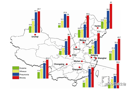 有研究人員從2010年到2012年期間,在國內10個城市,對將近5萬個3-6歲的兒童進行關于過敏性疾病的調查,超過一半的兒童患有鼻炎、哮喘、濕疹中的至少一種,其中鼻炎的發病率高達24%~50.8%。在鼻炎患病率最高的武漢,超過一半的兒童患有鼻炎。其他城市的情況,感興趣的朋友可以仔細看看(見圖1)。兒童的過敏性疾病患病率在國內呈不斷上升的趨勢,需要我們給予更多的關注