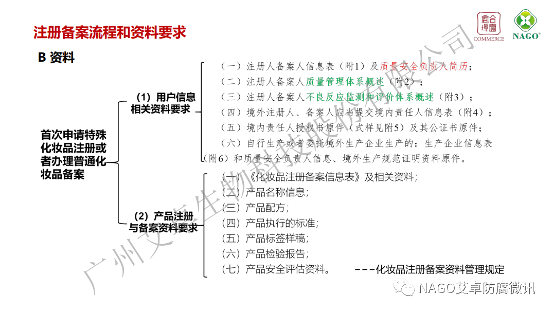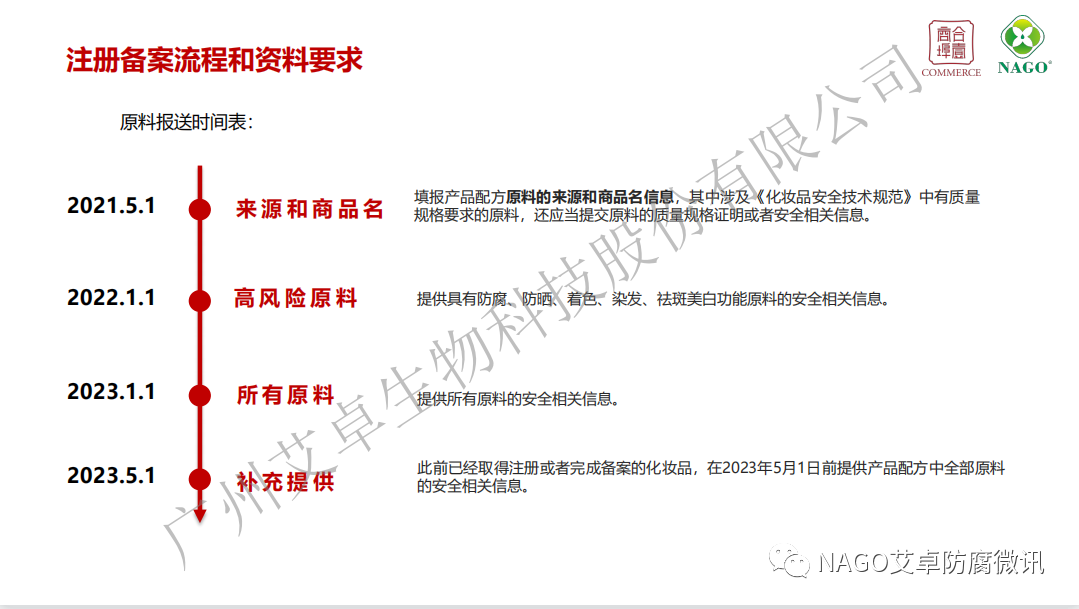 (2)自2022年1月1日起,注冊人備案人申請注冊或者進(jìn)行備案時,應(yīng)當(dāng)按照《規(guī)定》的要求,提供具有防腐、防曬、著色、染發(fā)、祛斑美白功能原料的安全相關(guān)信息。