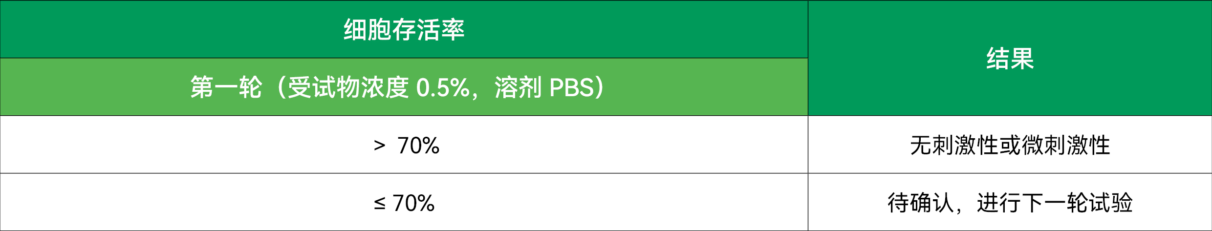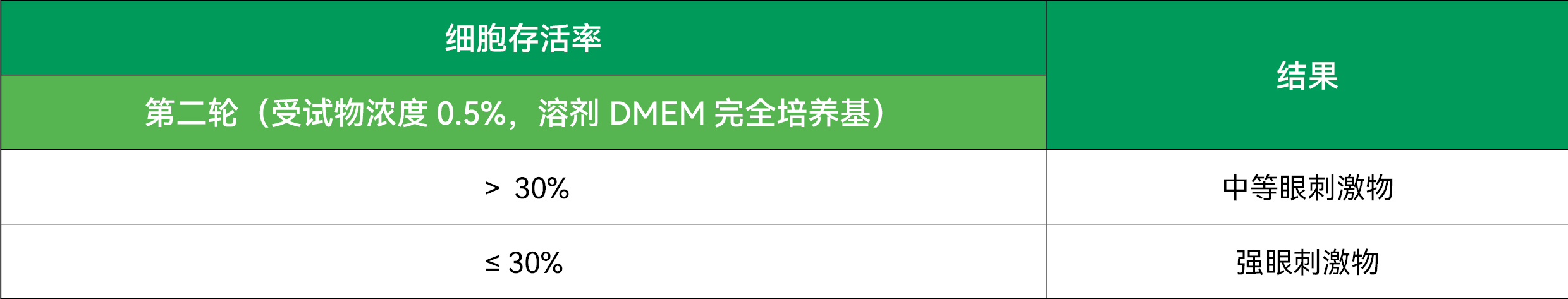 ②、根據(jù)行業(yè)標準SN/T3084.2-2014進出口化妝品眼刺激性試驗第2部分:角膜細胞試驗方法,在稀釋受試物時,統(tǒng)一稀釋到0.5%,溶劑使用PBS,作用5min后,使用MTT法或者CCK-8法測定細胞的吸光度,計算出相應的細胞存活率。當這一次實驗出現(xiàn)細胞存活率≤70%的情況,需要開始第二輪試驗,受試物濃度不變與上一次實驗相同,溶劑改用DMEM完全培養(yǎng)基,同樣方法測試,最后計算相對細胞存活率。判斷標準: